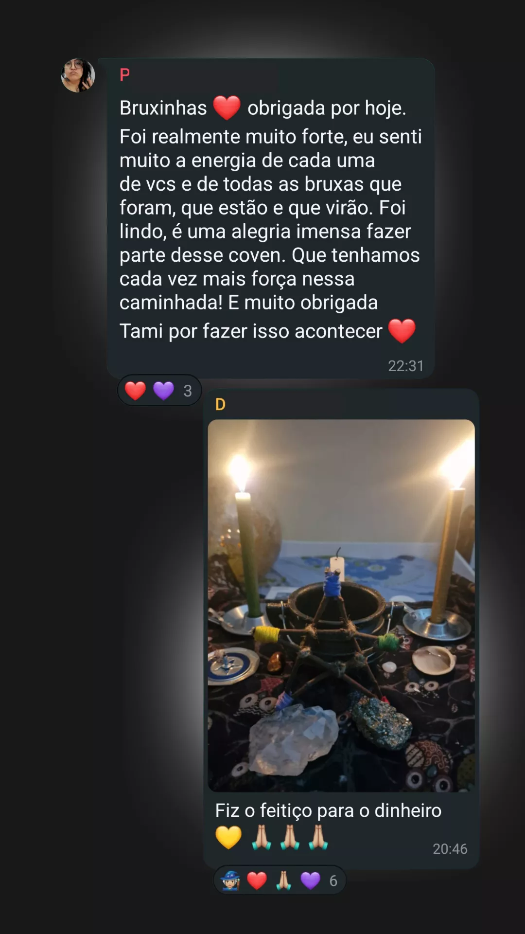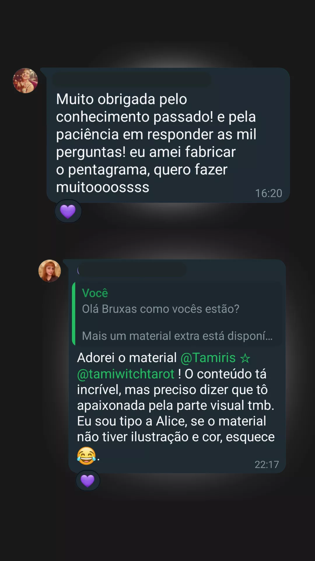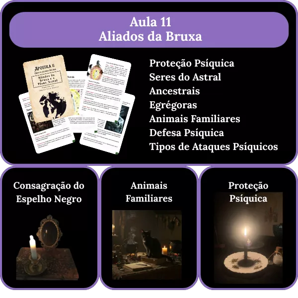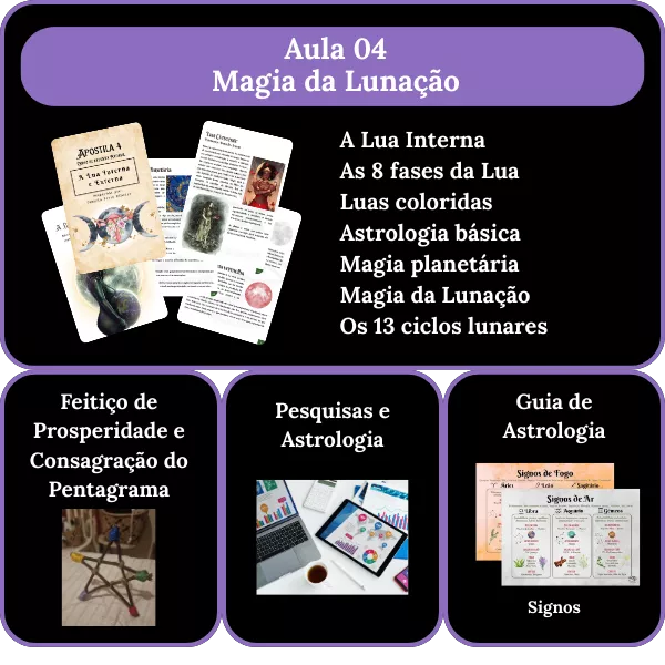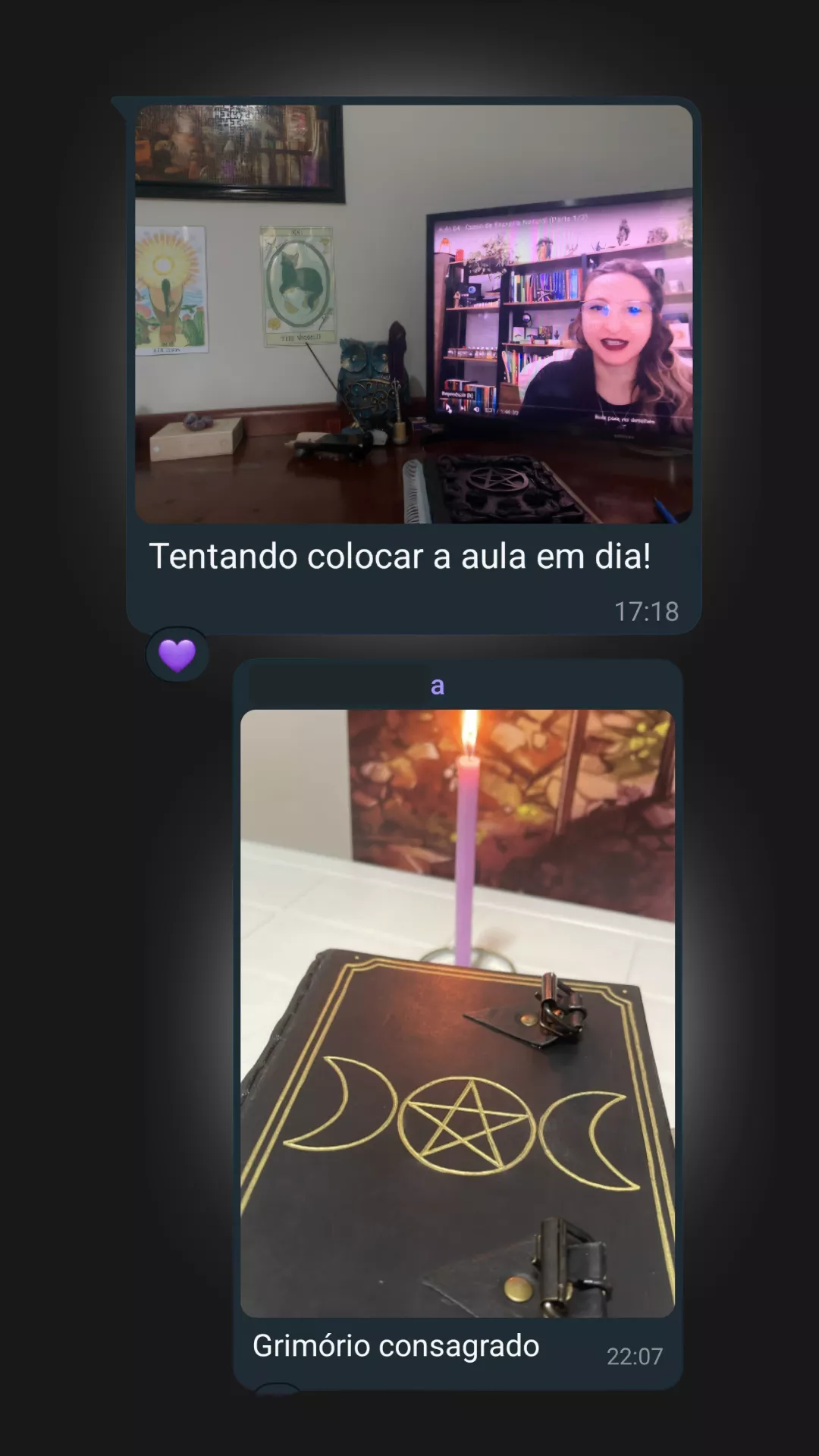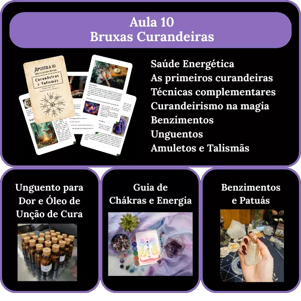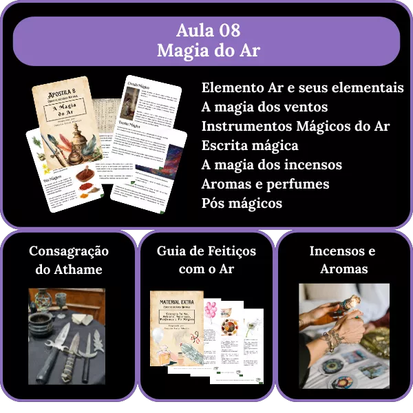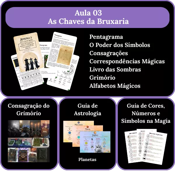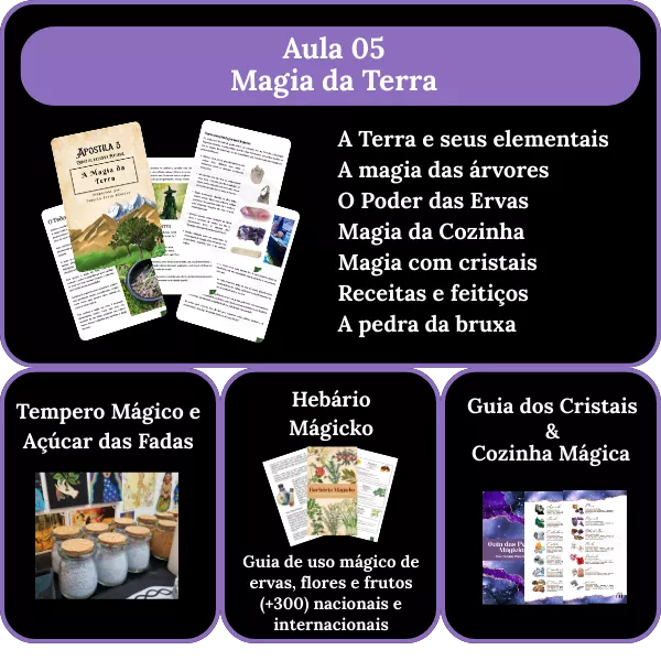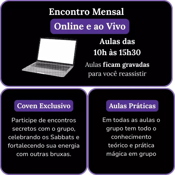As aulas são super interativas e o grupo muito unido. Você poderá tirar suas dúvidas, compartilhar experiências e ao longo das aulas irá fazer rituais mágicos de maneira prática tanto para você quanto para o grupo despertando sua intuição