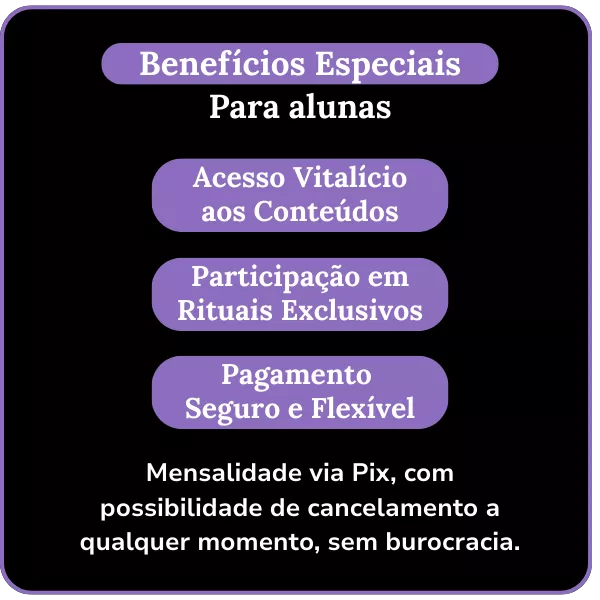 Ao longo de 13 meses, você vai mergulhar em rituais, feitiços, elementos da natureza, astrologia, símbolos e saberes ocultos com apoio contínuo, aulas ao vivo e um grupo seguro para trocar experiências.