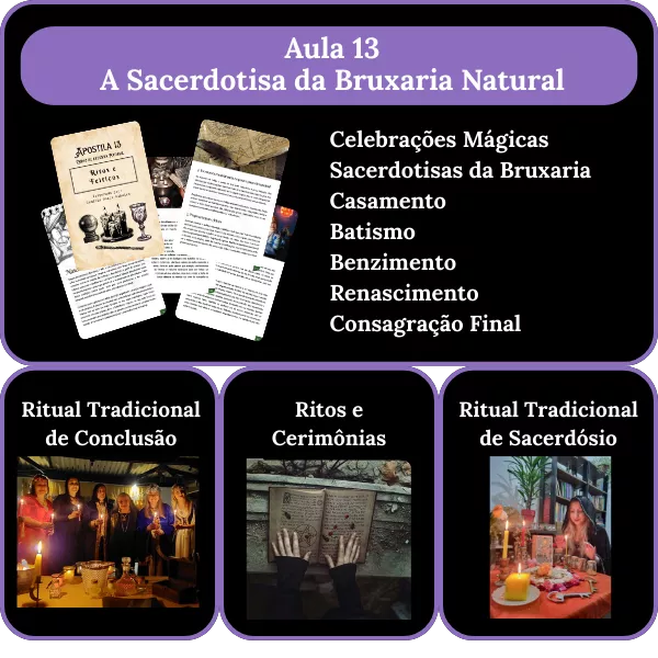 Ao término do ciclo de treze luas, participe do ritual exclusivo e secreto de consagração na Bruxaria e se torne uma Sacerdotisa da Bruxaria Natural e guardiã dos conhecimentos ancestrais.